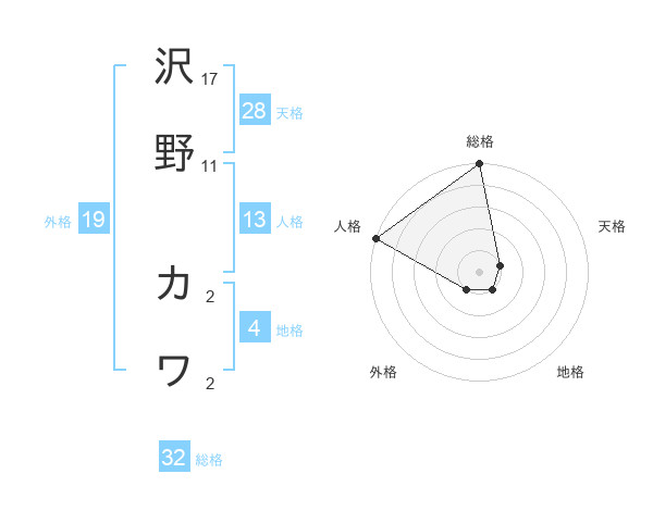 沢野 カワさんの総格は32画の5点!