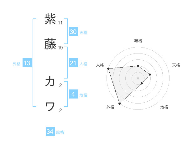紫藤 カワさんの総格は34画の2点!