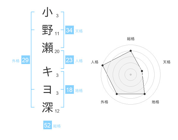 小野瀬 キヨ深さんの総格は52画の4点!