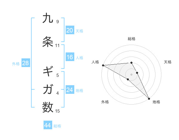 九条 ギガ数さんの総格は44画の2点!