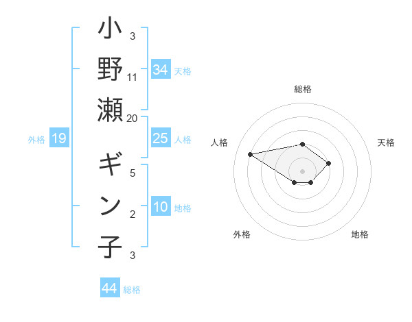 小野瀬 ギン子さんを姓名の画数から五運を鑑定