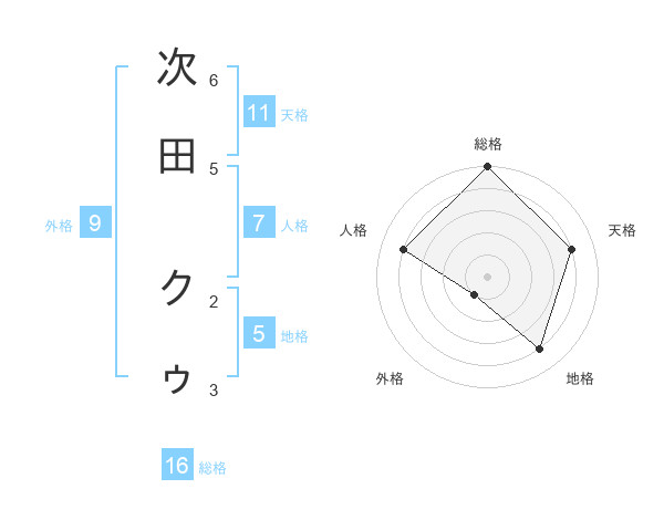 次田 クゥさんの総格は16画の5点!
