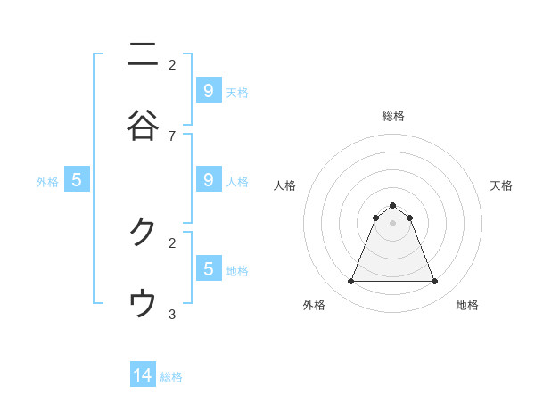 二谷 クウさんの地格は5画の4点!