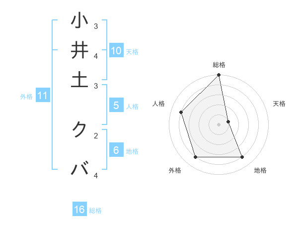 小井土 クバさんの総格は16画の5点!