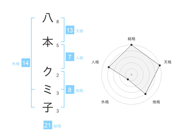 八本 クミ子さんの総格は21画の5点!