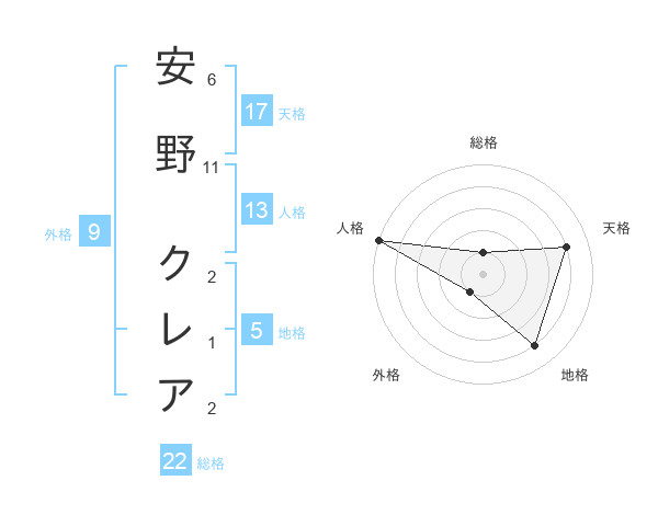 安野 クレアさんの総格は22画の1点!