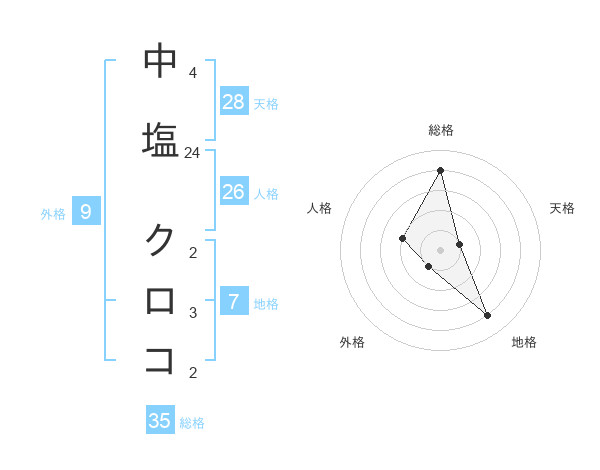中塩 クロコさんを姓名の画数から五運を鑑定