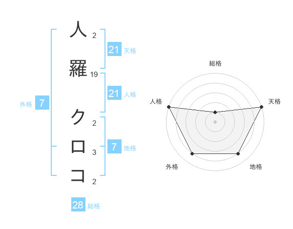 人羅 クロコさんの天格は21画の5点!