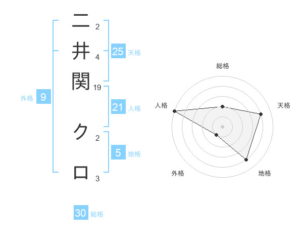 二井関 クロさんの総格は30画の2点!