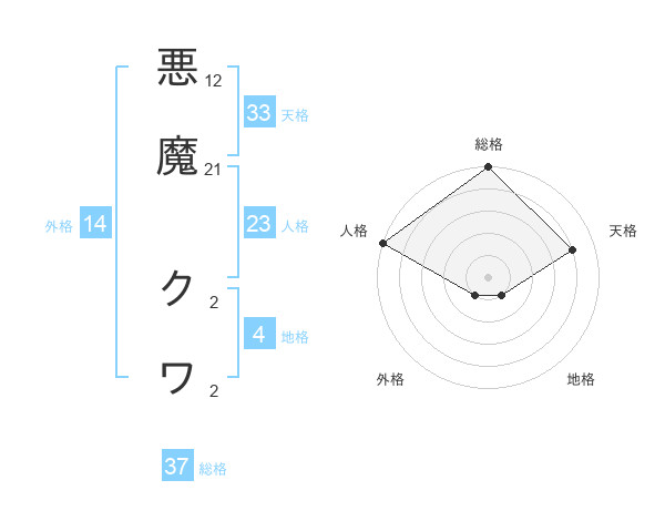 悪魔 クワさんの総格は37画の5点!