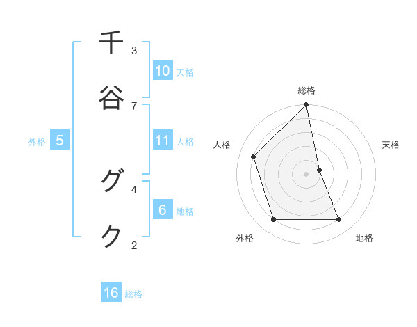 千谷 グクさんの総格は16画の5点!