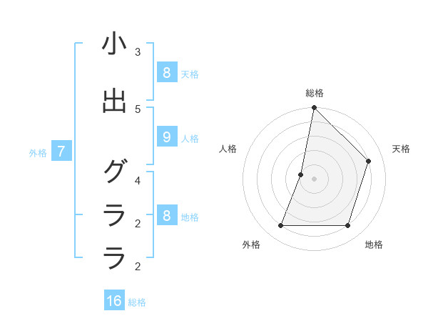 小出 グララさんの総格は16画の5点!