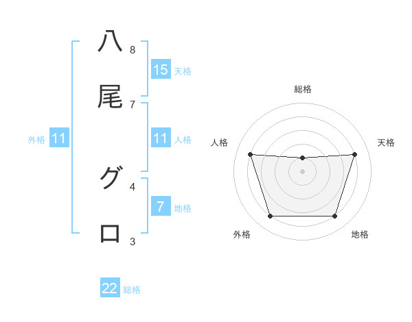 八尾 グロさんの総格は22画の1点!