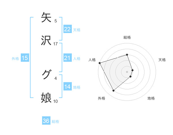 矢沢 グ娘さんの人格は21画の5点!