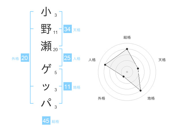 小野瀬 ゲッパさんを姓名の画数から五運を鑑定