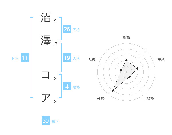 沼澤 コアさんの総格は30画の2点!