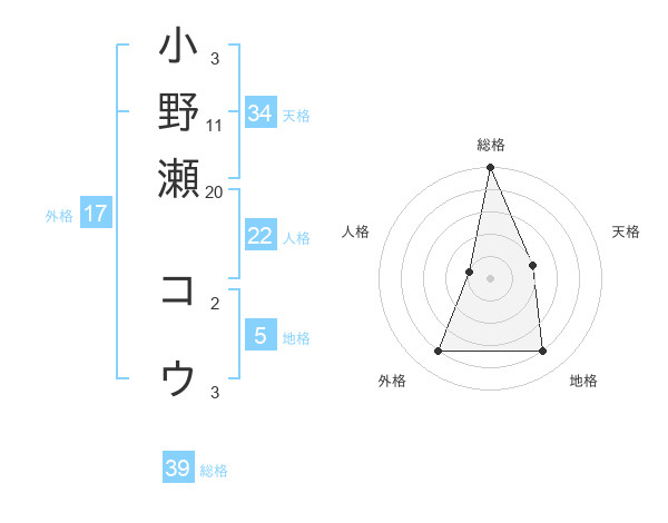 小野瀬 コウさんの総格は39画の5点!