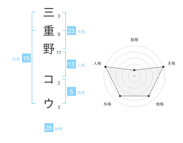 三重野 コウさんの天格は23画の5点