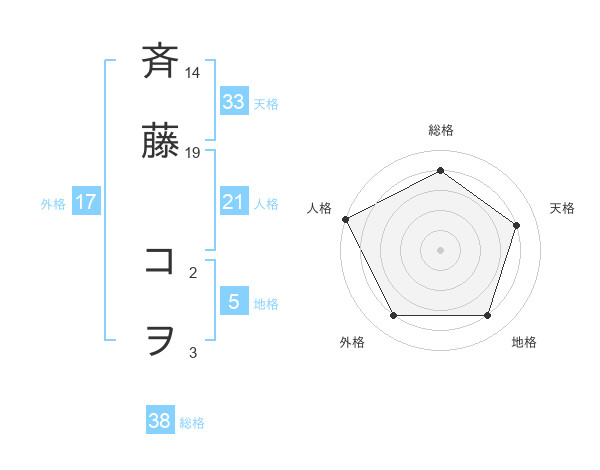 斉藤 コヲさんの総格は38画の4点!