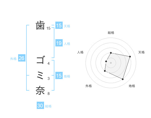 歯 ゴミ奈さんの天格は15画の4点!