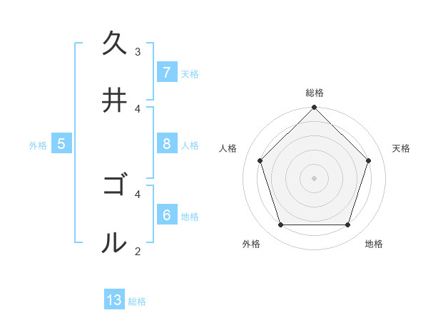 久井 ゴルさんの総格は13画の5点!