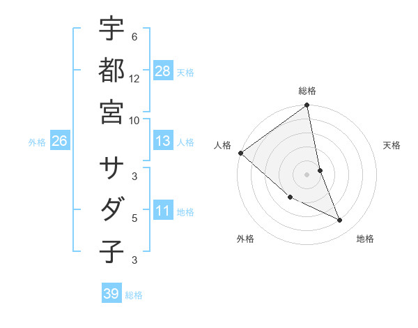 宇都宮 サダ子さんの総格は39画の5点!