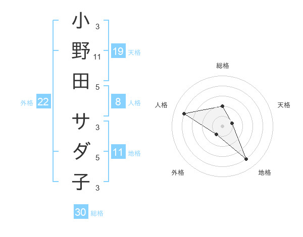 小野田 サダ子さんを姓名の画数から五運を鑑定