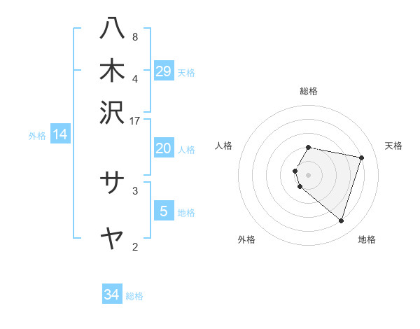 八木沢 サヤさんの総格は34画の2点!