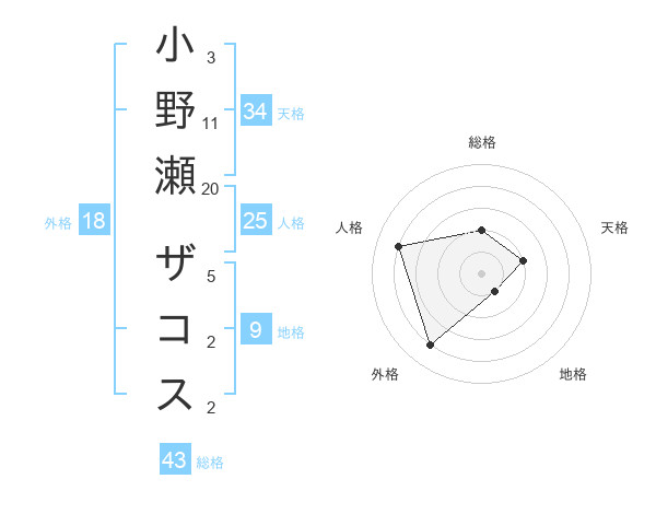 小野瀬 ザコスさんを姓名の画数から五運を鑑定