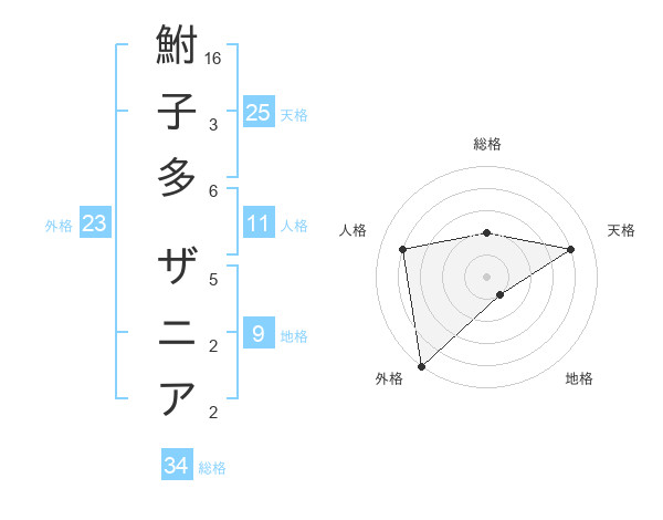 鮒子多 ザニアさんの総格は34画の2点!