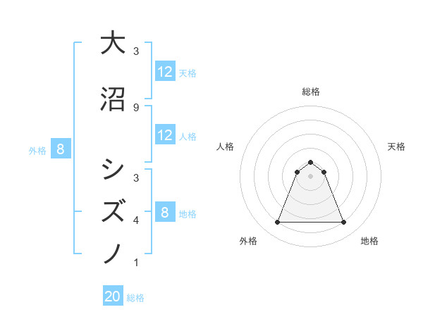 大沼 シズノさんを姓名の画数から五運を鑑定