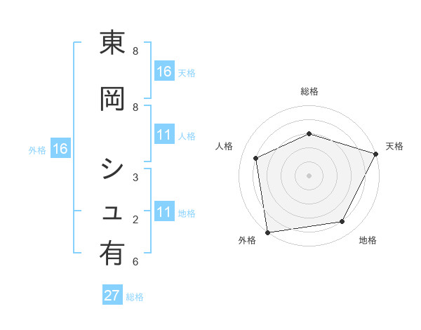 東岡 シュ有さんの総格は27画の3点!