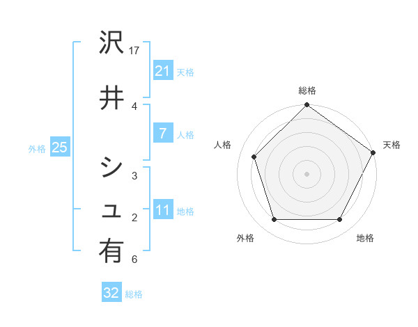 沢井 シュ有さんの天格は21画の5点!