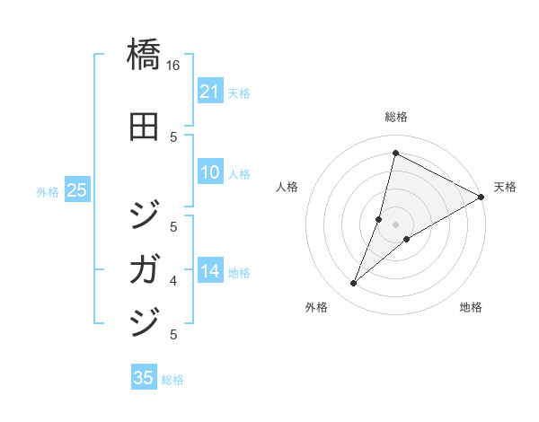 橋田 ジガジさんを姓名の画数から五運を鑑定