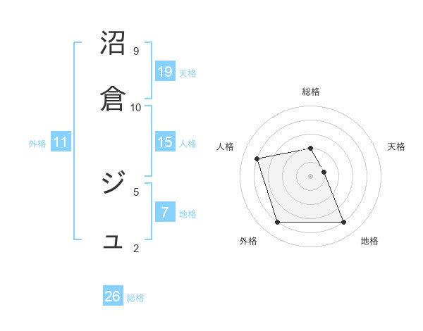 沼倉 ジュさんを姓名の画数から五運を鑑定