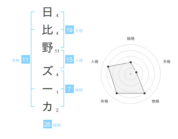 日比野 ズーカさんを姓名の画数から五運を鑑定