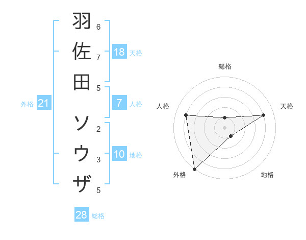 羽佐田 ソウザさんの外格は21画の5点!
