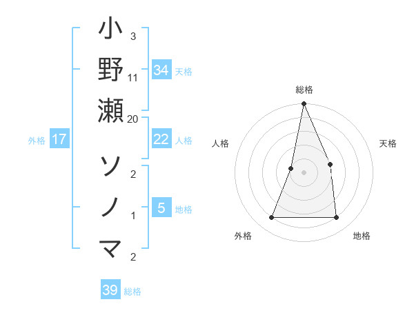 小野瀬 ソノマさんの総格は39画の5点!