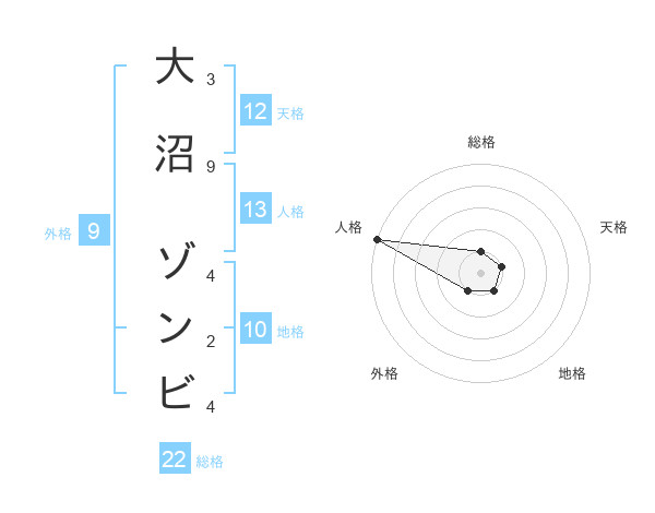 大沼 ゾンビさんの総格は22画の1点!