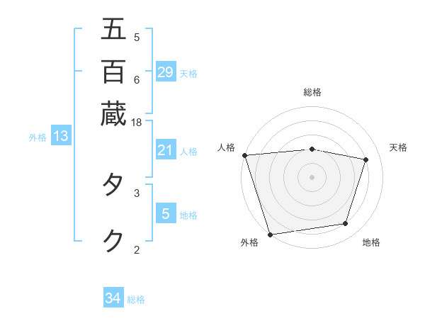 五百蔵 タクさんの総格は34画の2点!