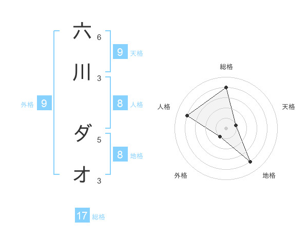 六川 ダオさんの外格は9画の1点!