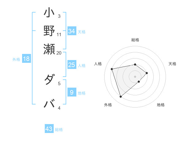 小野瀬 ダバさんを姓名の画数から五運を鑑定