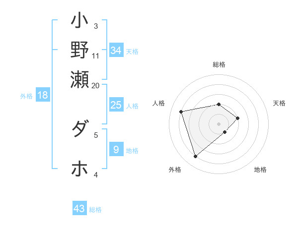 小野瀬 ダホさんを姓名の画数から五運を鑑定