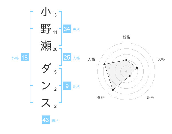 小野瀬 ダンスさんの総格は43画の2点!