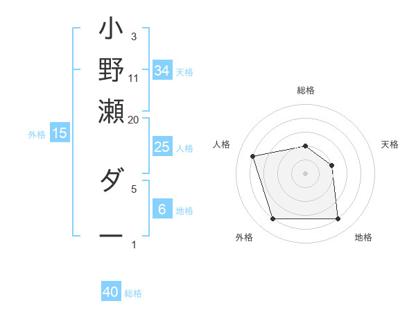 小野瀬 ダーさんを姓名の画数から五運を鑑定