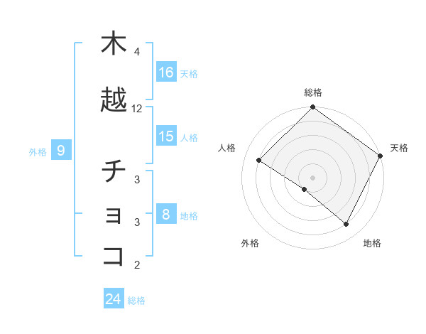 木越 チョコさんの天格は16画の5点!