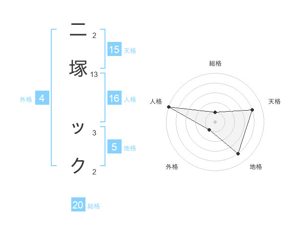 二塚 ックさんの総格は20画の1点!