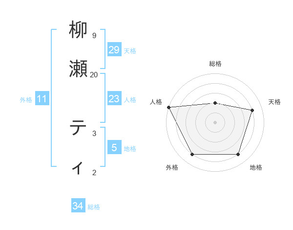 柳瀬 ティさんを姓名の画数から五運を鑑定