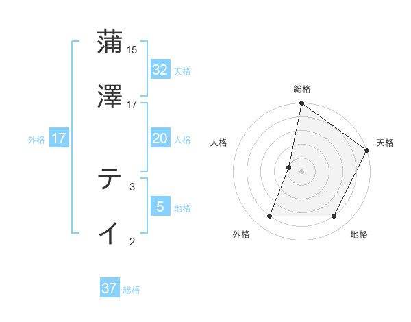 蒲澤 テイさんの総格は37画の5点!