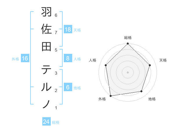 羽佐田 テルノさんを姓名の画数から五運を鑑定